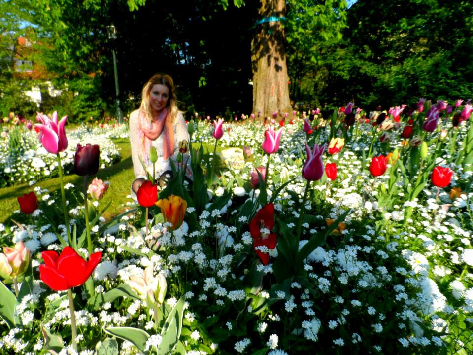 In Bruges, we came across a little field of flowers in the park full of brightly coloured tulips.Β  It was too tempting not to act like the fairy/Disney Princess I really am and sit right in the middle for a photo πŸ™‚