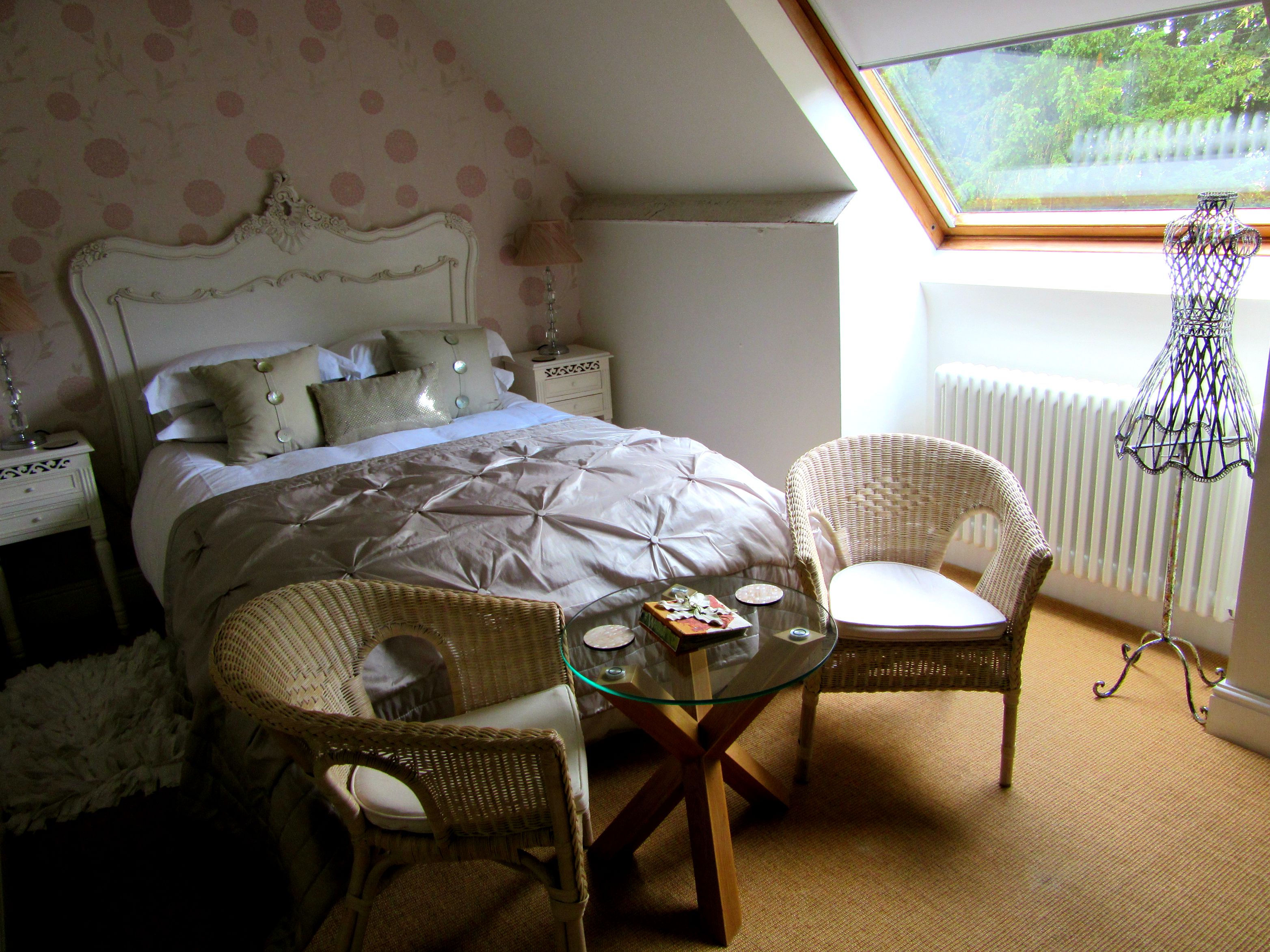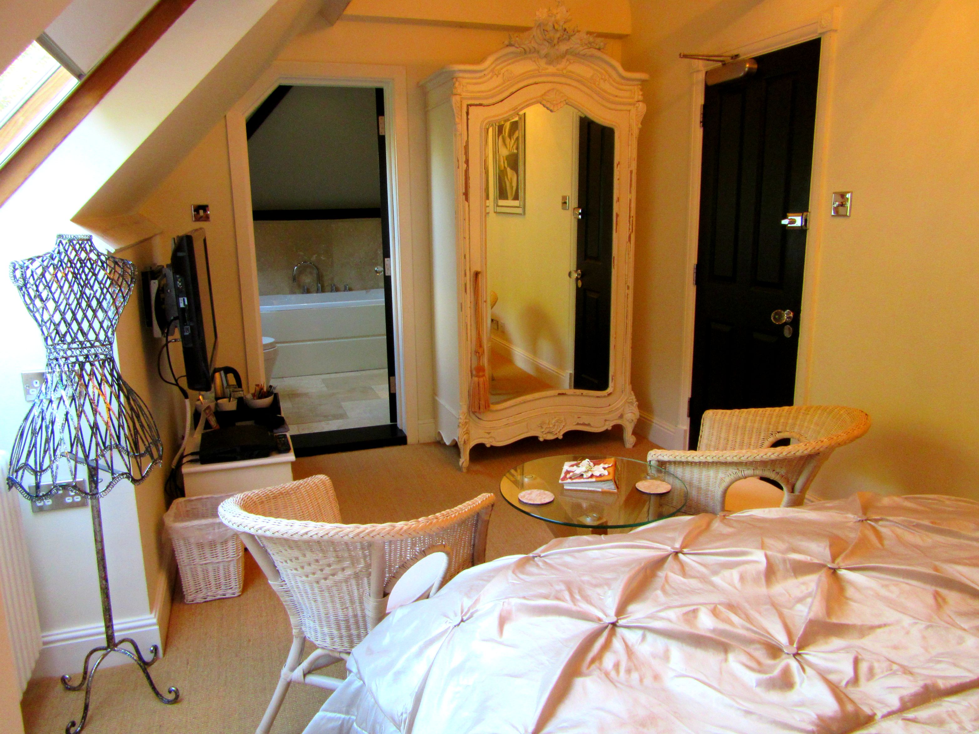 We stayed in the Lily room, the smallest of the five rooms but still just as beautiful with pretty pastel colours and vintage décor giving it it’s luxury feel, and silk sheets covering the bed that looked oh so comfy.  The skylight looked out into the leafy garden and flooded the room with lots of light.