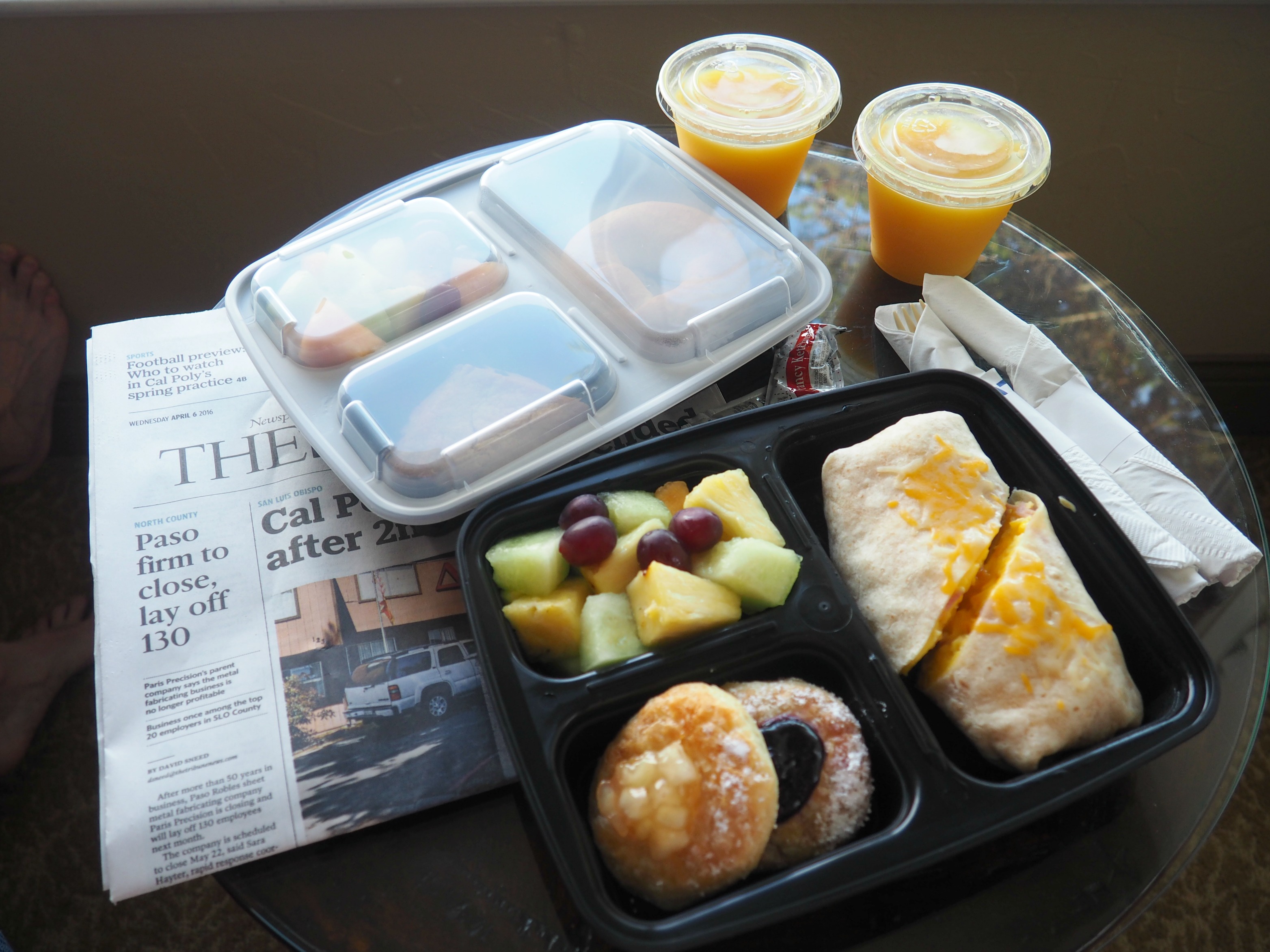 Sure enough, the next morning we were greeted by a knock on the door at the exact time we had requested our breakfast and in came a tray full of delicious smelling goodies from fresh fruit and sugar sprinkled pastries to cream cheese filled bagels and hot egg wraps, along with some deliciously fresh OJ.