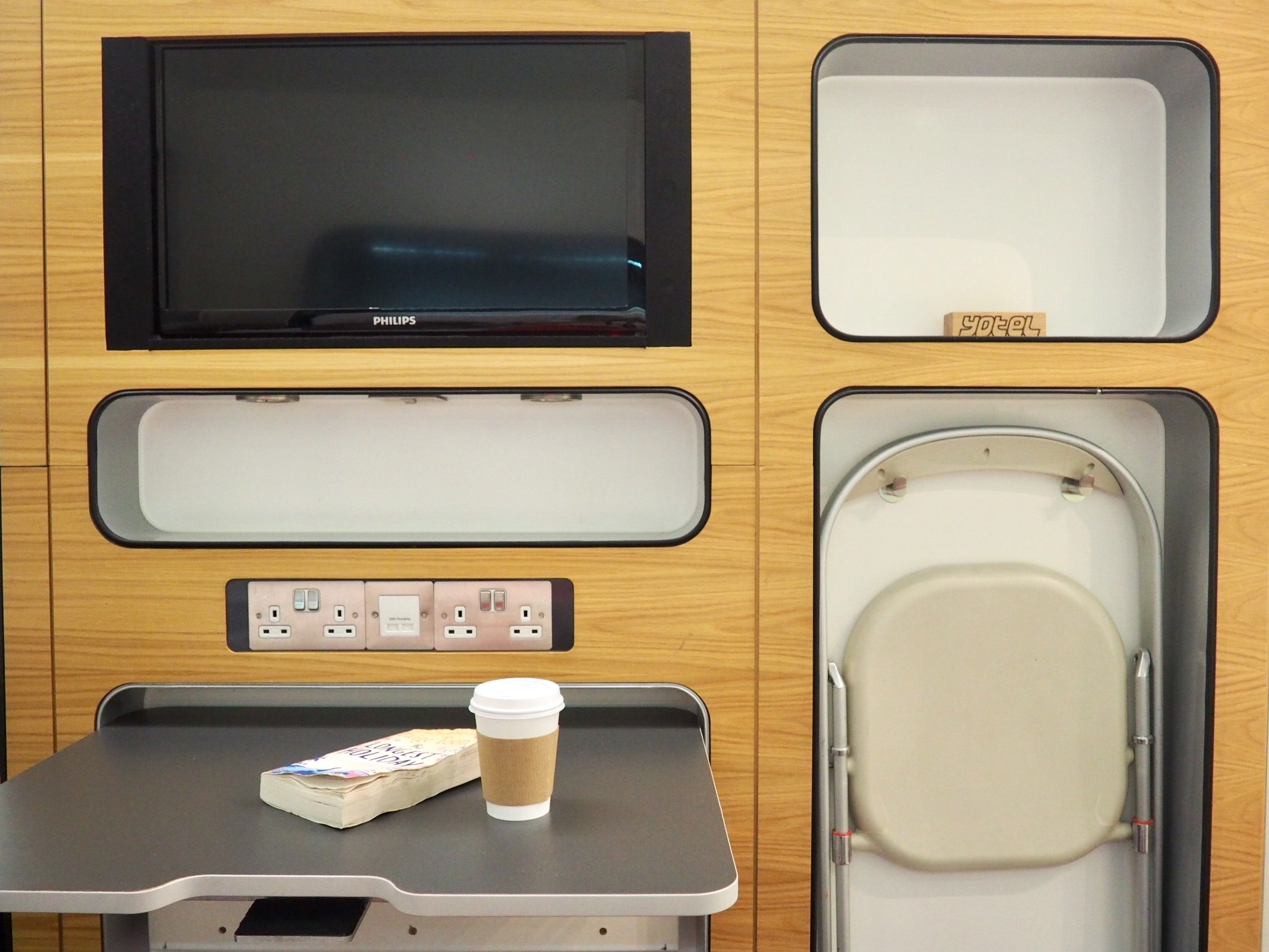 The rooms are fairly small and compact but are really cleverly designed and have a bit of a smart modern tech vibe that makes you feel you’re in your own private cabin on a plane. There is a table and chair workstation that you can get out or fold away giving extra room and suitcases slide neatly underneath the bed.