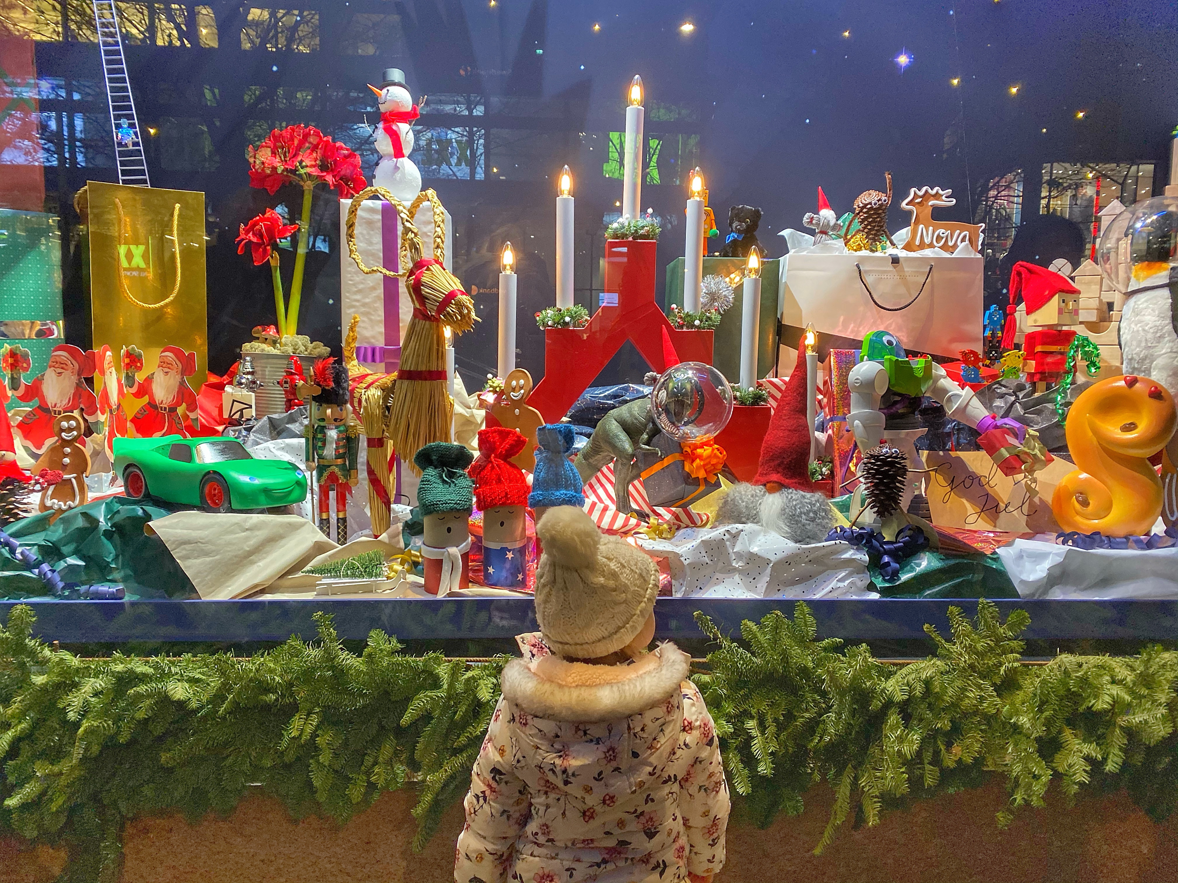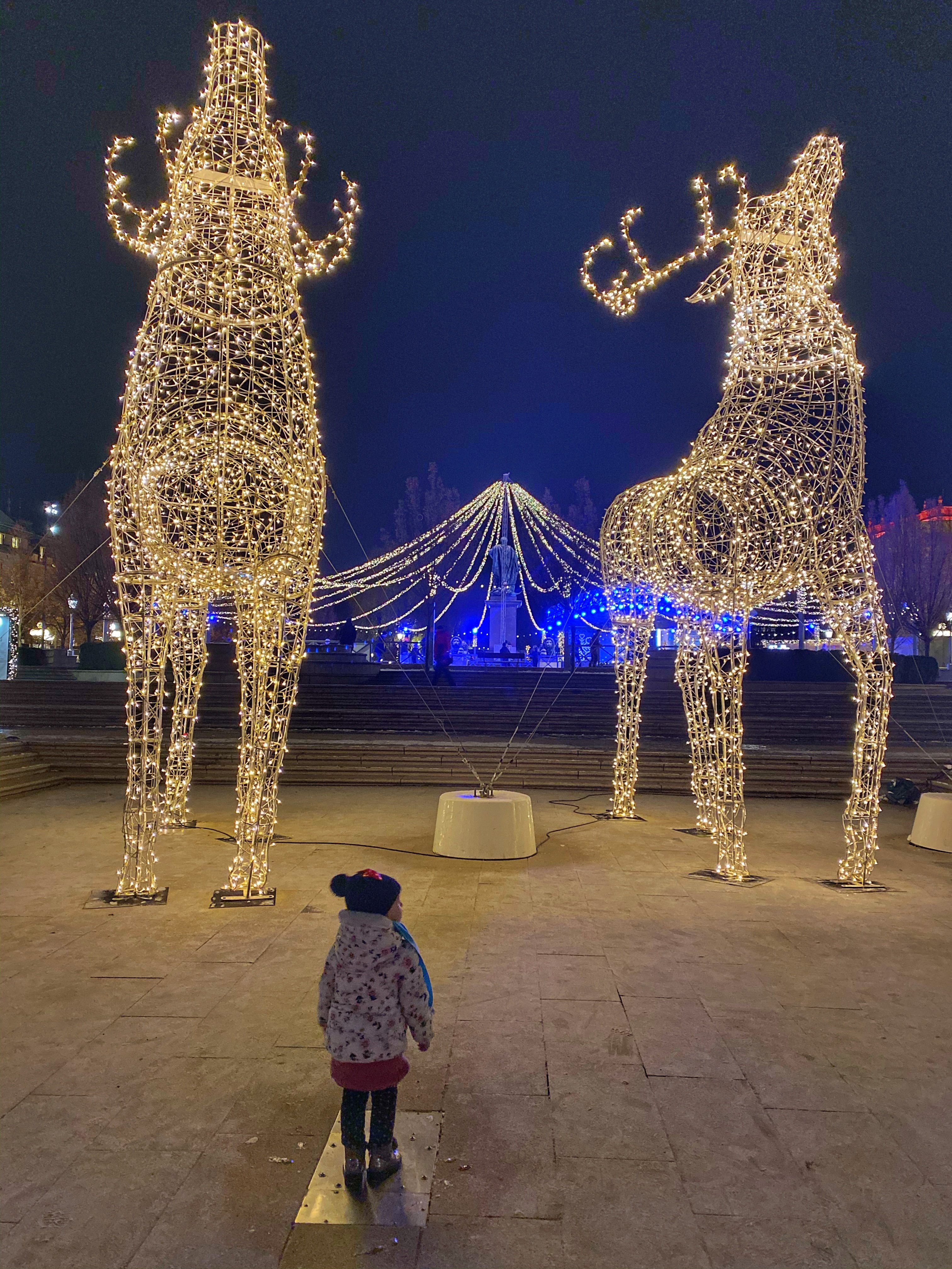 Twinkly Christmas lights can be found all over the city lining the shopping streets but Evie mostly loved the giant reindeer which tower over everything and brighten up the dark night’s sky.